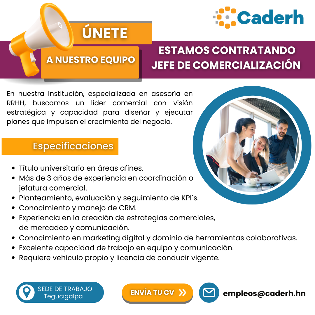 En CADERH, líder en asesoría en RRHH, capacitación y renta de oficinas y salas de reuniones, buscamos un Líder Comercial proactivo, con liderazgo y enfoque estratégico, que impulse el crecimiento del negocio a través de la implementación de estrategias comerciales y de comunicación.