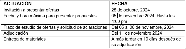 La oferta económica/cotización y los documentos solicitados, deberán ser entregados a más tardar en el lunes 05 de noviembre del 2024 a las 4:00 p.m., en la electrónica mencionadas.