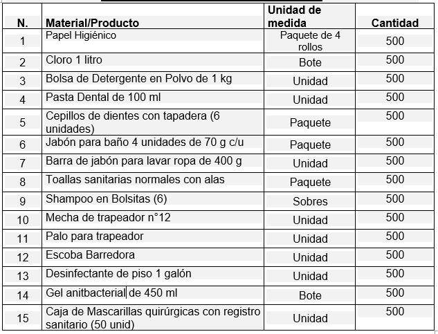 Adquirir 500 kits de Higiene y Bioseguridad familiar.
