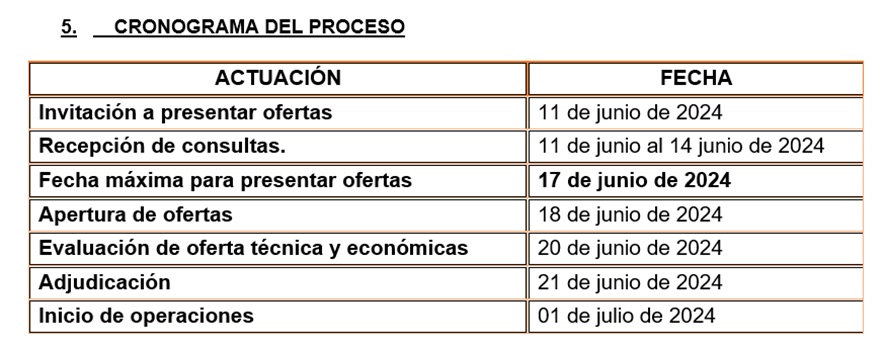 La oferta deberá presentarse a más tardar el día lunes, 17 de junio de 2024, la hora límite de recepción de ofertas será a las 23:59, hora oficial de la Republica de Honduras.