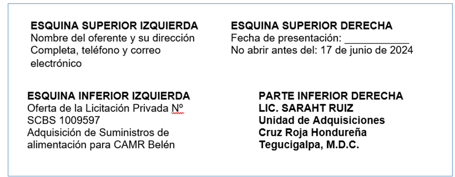- La Cruz Roja Hondureña no considerará ninguna oferta que llegue con posterioridad al plazo límite para la presentación de ofertas, por lo que no se recibirán ofertas después de las 23:59, del lunes 17 de junio 2024, en virtud de las fechas indicadas en la sección 4.