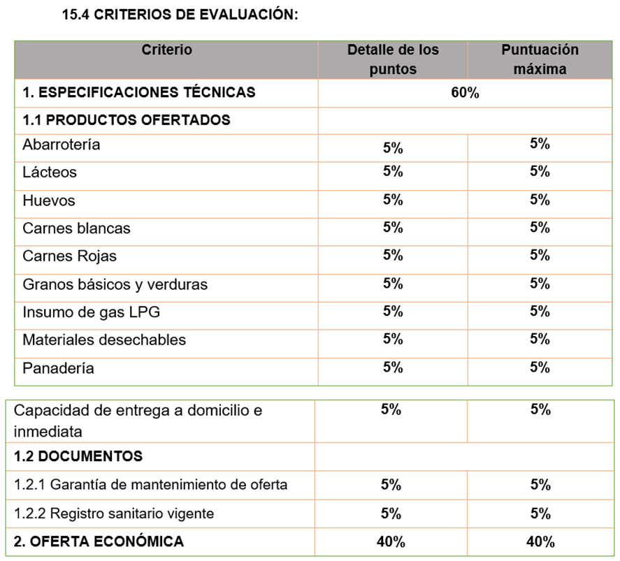 El porcentaje de evaluación será de 60/40, siendo el máximo puntaje de 60% el proveedor que cumpla con las especificaciones técnicas detalladas, documentos legales, permisos de operación y registros sanitarios; el porcentaje de 40 se le brindará al proveedor que cumpla con la oferta más baja y dentro del presupuesto, si todas las ofertas cumplen con el presupuesto tendrán la misma puntuación, de lo contrario se aplicará el método basado en la proporcionalidad o de acuerdo a lo que el comité evaluador designe.