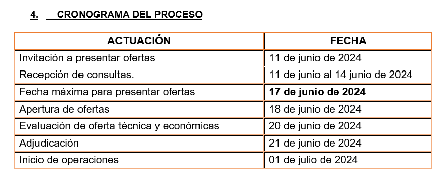 La oferta deberá presentarse a más tardar el día lunes, 17 de junio de 2024, la hora límite de recepción de ofertas será a las 23:59, hora oficial de la Republica de Honduras.