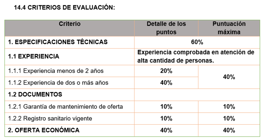 El porcentaje de evaluación será de 60/40, siendo el máximo puntaje de 60% el proveedor que cumpla con las especificaciones técnicas detalladas en la sección 2, documentos legales, permisos de operación y registros sanitarios; el porcentaje de 40 se le brindará al proveedor que cumpla con la oferta más baja y dentro del presupuesto, si todas las ofertas cumplen con el presupuesto tendrán la misma puntuación, de lo contrario se aplicará el método basado en la proporcionalidad o de acuerdo a lo que el comité evaluador designe.