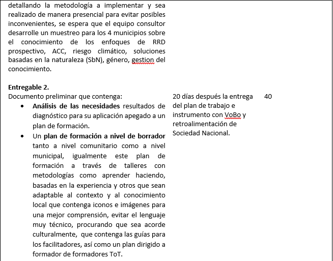 Plan de trabajo de la consultoría que incluya la metodología con sus herramientas, el desarrollo de las distintas actividades de manera detallada y con su respectivo cronograma. Así como la elaboración de un instrumento inclusivo para un diagnóstico rápido de las necesidades de fortalecimiento diferenciando las que son del personal técnico de los 4 municipios y de organizaciones comunitarias, detallando la metodología a implementar y sea realizado de manera presencial para evitar posibles inconvenientes, se espera que el equipo consultor desarrolle un muestreo para los 4 municipios sobre el conocimiento de los enfoques de RRD prospectivo, ACC, riesgo climático, soluciones basadas en la naturaleza (SbN), género, gestión del conocimiento.