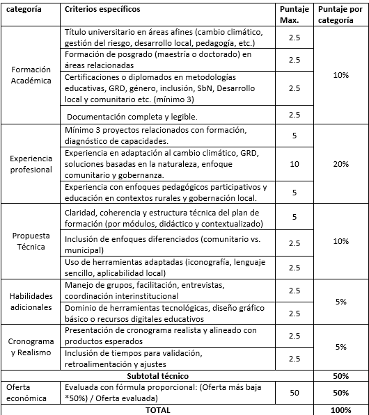 Título universitario mínimo o equipo consultor con especialidades en pedagogía, cambio climático o profesional multidisciplinario en, soluciones basadas en la naturaleza, genero, desarrollo sostenible, ciencias ambientales y desarrollo local o comunitario.