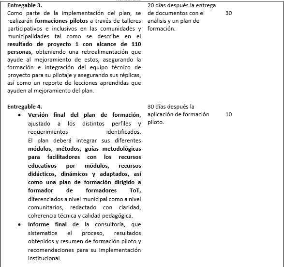 Entrega de informe final, plan de capacitación con lecciones aprendidas y anexos contenidos por módulos, resumen de formación piloto y sus recomendaciones, insumos, instrumentos, plan de formación y guías metodológicas para formador de formadores con los recursos educativos por módulos, otros que surjan de la consultoría.