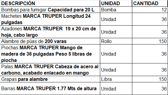 Título de términos: “Compra de herramientas, equipo e insumos para fincas familiares y sistemas de riego”