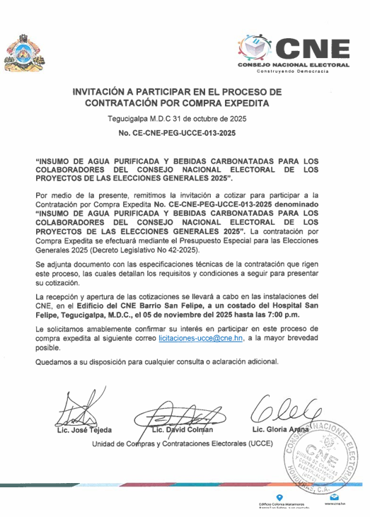 Pliegos de condiciones del proceso de contratación por procedimiento por compra expedita “Insumo de agua purificada y bebidas carbonatadas para los colaboradores del CNE de los Proyectos de las Elecciones Generales 2025”