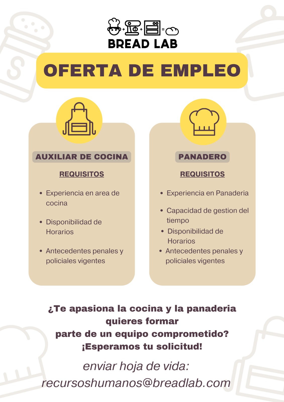 - Experiencia mínima de un (1) año en el manejo de personal y en servicio de alimentación hospitalaria.