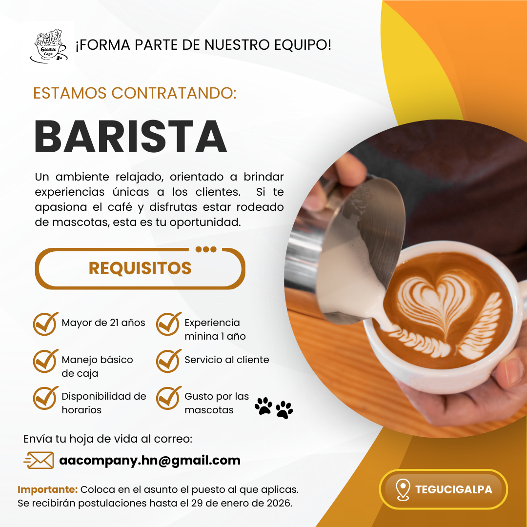 Bartender TEGUCIGALPA Lee más sobre Bartender TEGUCIGALPA En Grupo San José buscamos un Barista entusiasta y apasionado por el café para formar parte de nuestro equipo.Responsabilidades principales: